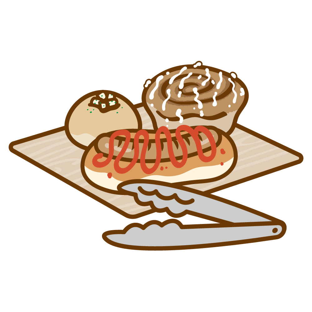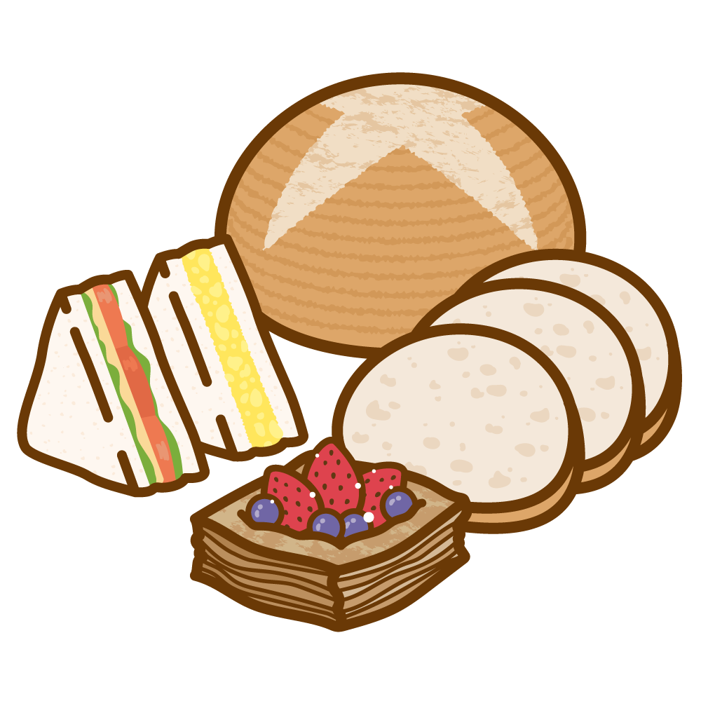 パンのイラスト 2022年2月5日 最終更新日時 : 2022年2月5日 管理人もも ●いろんなパンのイラスト●パン屋さんの棚のイラスト●トレーにのったパンのイラスト 食パン フランスパン カンパーニュ シナモンロール デニッシュ クロワッサン ロールパン メロンパン クリームパン あんぱん カレーパン 調理パン ベーグル ドーナツ スコーン サンドイッチ たまごサンド ミックスサンド フルーツサンド カツサンド まとめのパン まとめのパン パン屋さんの棚 トレーのパン トレーのパン